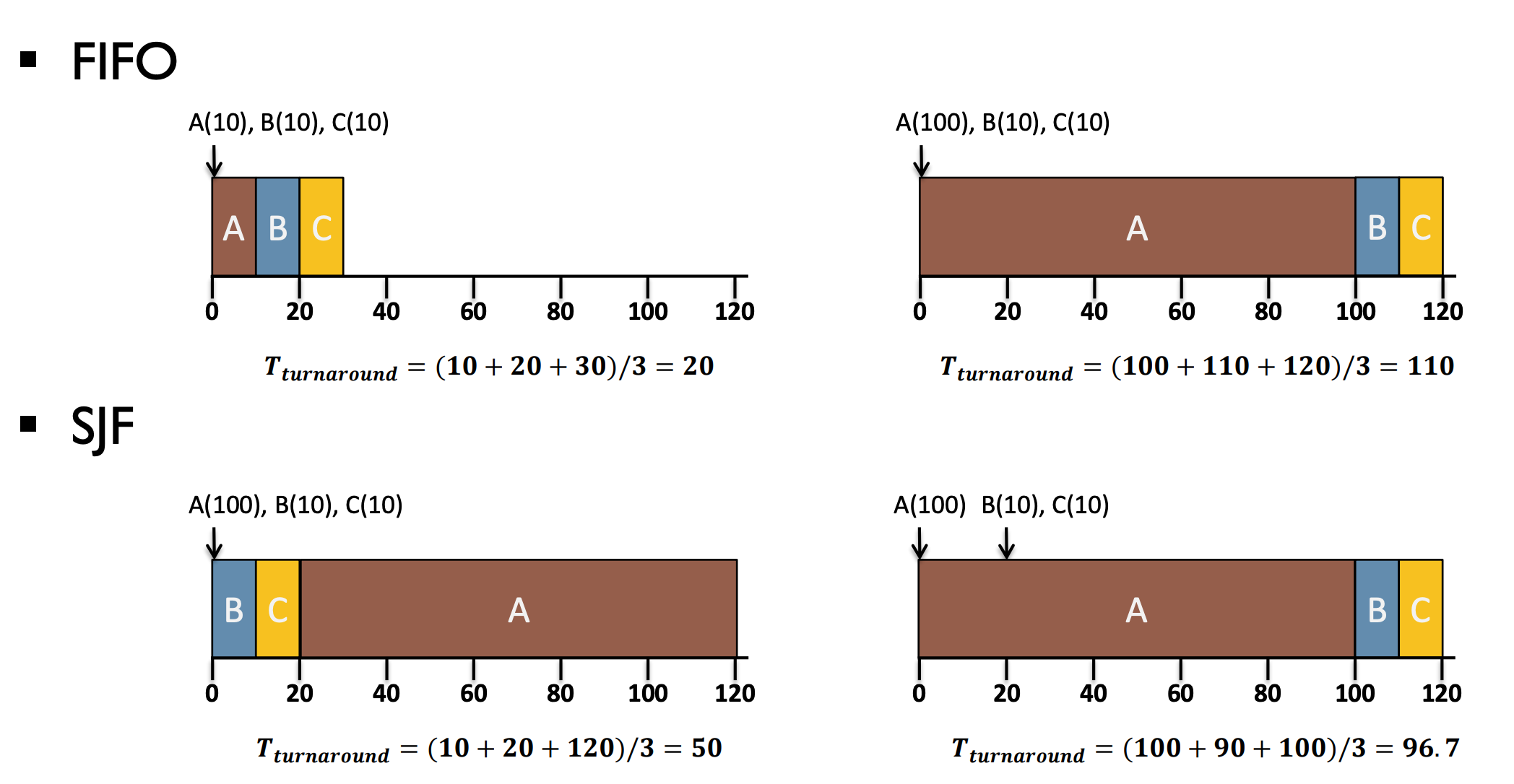 - Non-preemtive: P0가 돌고 있는 중에, P0의 남은 시간보다 더 짧은 process P1가 queue에 도착해도, P0는 CPU를 뺏기지 않고 계속 일함. Non-preemtive CPU scheduler들 중에는 SJF가 가장 짧은 waiting time 제공