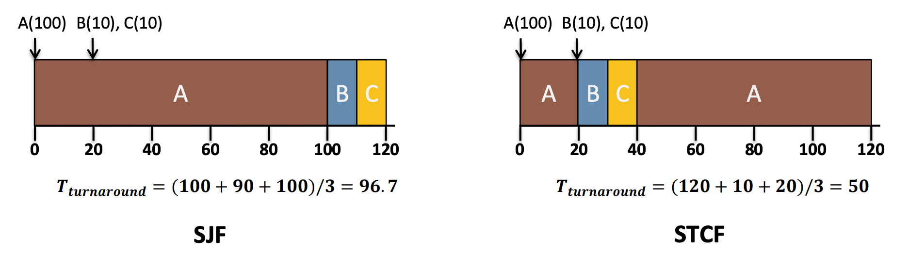 - Preemtive = Shorted-Remaining Time First(SRTF, 혹은 shortes-time to completion first로 STCF): P0가 돌고 있는 중에, P0의 남은 시간보다 더 짧은 process P1가 도착하면, P0는 CPU를 빼앗긴다. 언뜻보면 SRTF가 SJF보다 당연히 낫겠지! 라고 생각할 수 있으나, context switch overhead를 고려하면, SRTF가 항상 낫다고 하기 어렵다.