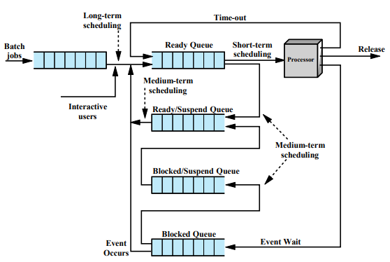 - Ready Queue -> Processor: Short-term scheduling이 process에게 CPU를 주면 process가 열심히 돌아감