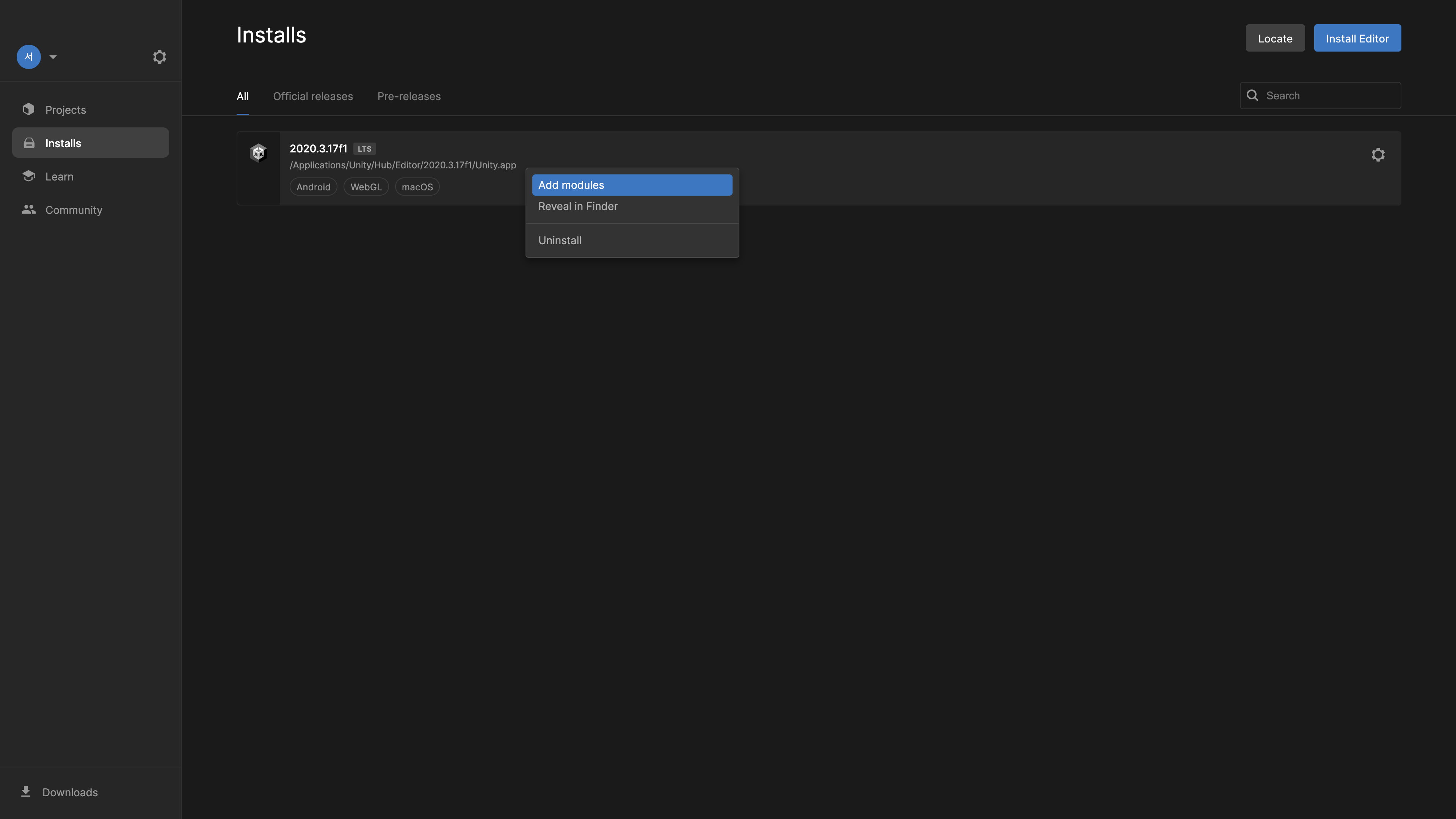 Installs에서 현재 unity version에 우클릭하여 Add modules를 누른다.