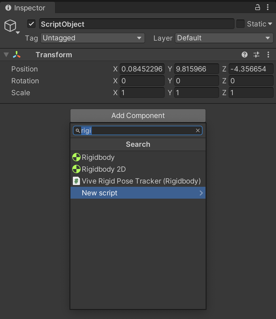 Step 3. 이제 새 Script를 만들어보자. Hierarchy에서 Create Empty를 해 주고, 해당 GameObject를 ScriptObject로 이름을 바꿔 주었다. Add component를 통해 new script를 추가하고, 이름을 달아준다.