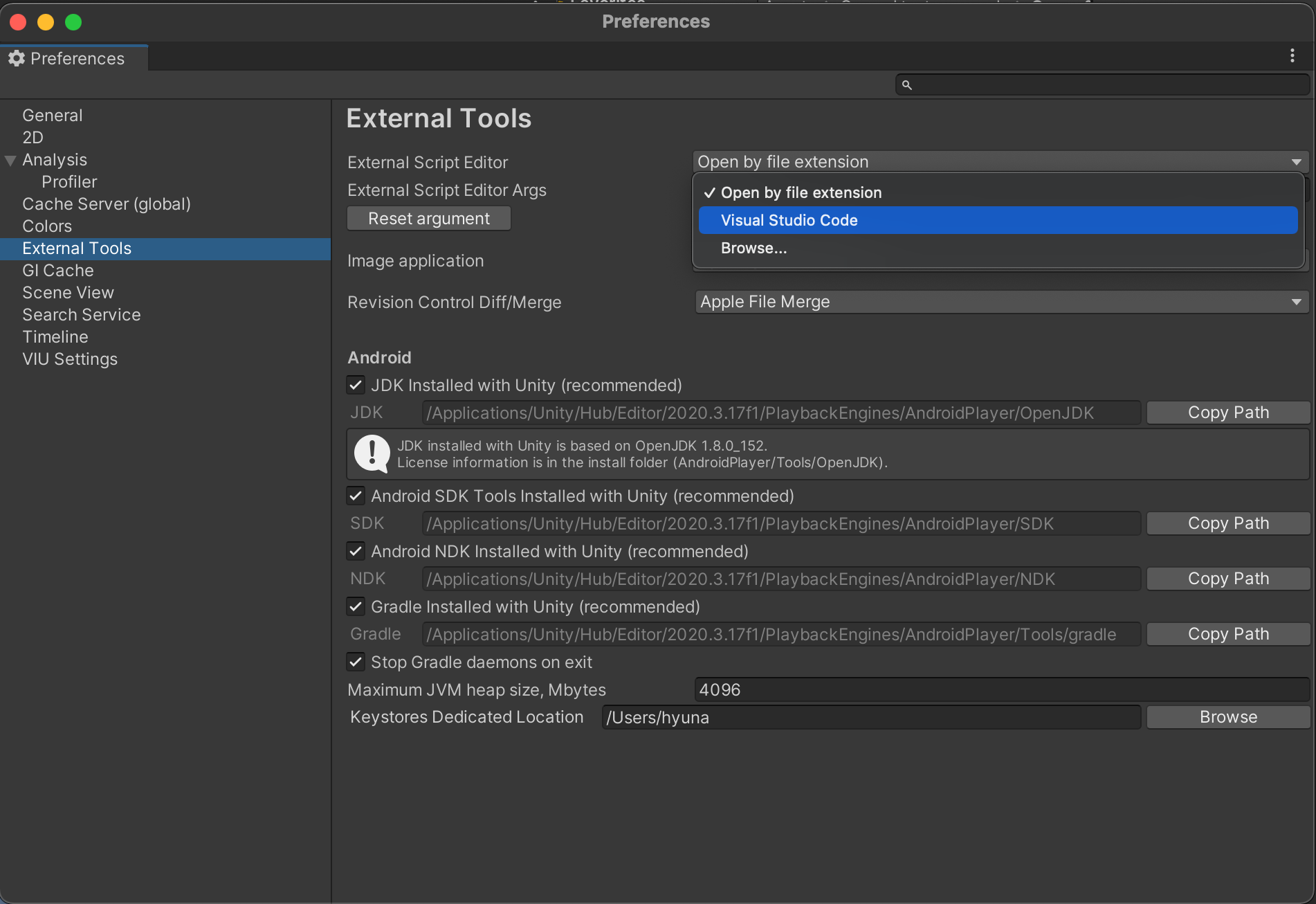 Step 2. Preferences > External Tools에서 External Script Editor를 찾고, Visual Studio Code로 설정한다.